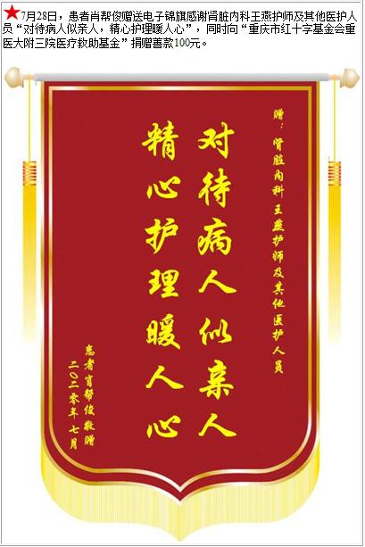 患者肖帮俊赠送电子锦旗感谢肾脏内科王燕护师及其他医护人员,并向医疗救助基金捐赠善款100元-锦旗-患者心声-患者服务-重庆医科大学附属第三医院【官方网站】