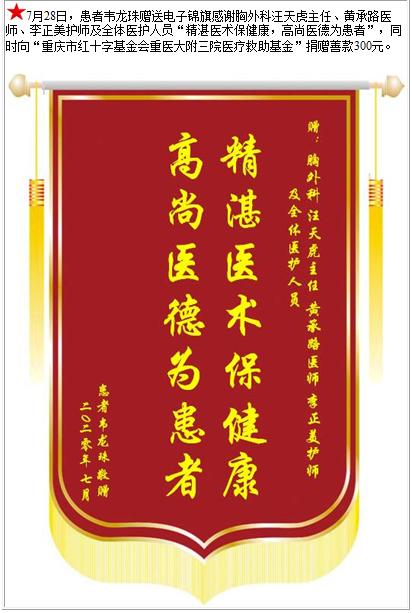 患者韦龙珠赠送电子锦旗感谢胸外科汪天虎主任等人及全体医护人员,并向医疗救助基金捐赠善款300元-锦旗-患者心声-患者服务-重庆医科大学附属第三医院【官方网站】
