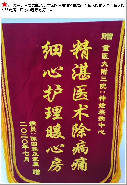 患者陈国蓉送来锦旗感谢神经疾病中心全体医护人员“精湛医术除病痛,细心护理暖心房”-锦旗-患者心声-患者服务-重庆医科大学附属第三医院【官方网站】