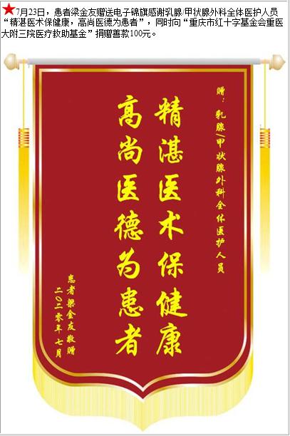 患者梁金友赠送电子锦旗感谢乳腺/甲状腺外科全体医护人员,并向医疗救助基金捐赠善款100元-锦旗-患者心声-患者服务-重庆医科大学附属第三医院【官方网站】