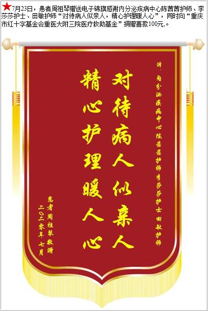 患者周祖琴赠送电子锦旗感谢内分泌疾病中心陈茜茜护师等人,并向医疗救助基金捐赠善款100元-锦旗-患者心声-患者服务-重庆医科大学附属第三医院【官方网站】