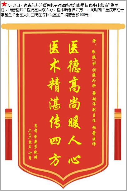 患者荣燕芳赠送电子锦旗感谢乳腺/甲状腺外科梁越洋副主任等人,并向医疗救助基金捐赠善款100元-锦旗-患者心声-患者服务-重庆医科大学附属第三医院【官方网站】