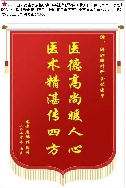 患者唐炜柏赠送电子锦旗感谢肝胆胰外科全体医生,并向医疗救助基金捐赠善款100-锦旗-患者心声-患者服务-重庆医科大学附属第三医院【官方网站】