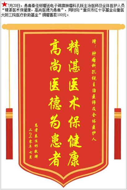 患者秦佳彬赠送电子锦旗肿瘤科孔锐主治医师及全体医护人员,并向医疗救助基金捐赠善款100元-锦旗-患者心声-患者服务-重庆医科大学附属第三医院【官方网站】