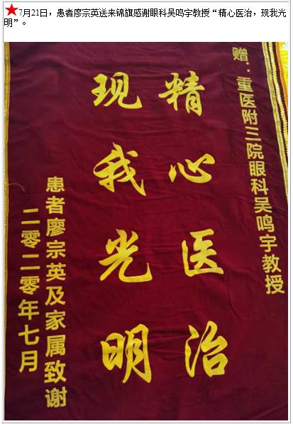 患者廖宗英送来锦旗感谢眼科吴鸣宇教授“精心医治,现我光明”-锦旗-患者心声-患者服务-重庆医科大学附属第三医院【官方网站】