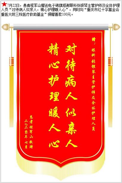 患者程军山赠送电子锦旗感谢眼科张银琴主管护师及全体护理人员,并向医疗救助基金捐赠善款100元-锦旗-患者心声-患者服务-重庆医科大学附属第三医院【官方网站】