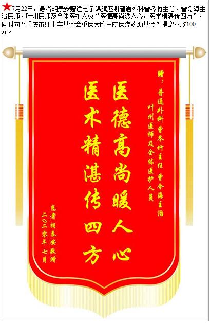 患者胡泰安赠送电子锦旗感谢普通外科曾冬竹主任等人及全体医护人员,并向医疗救助基金捐赠善款100元-锦旗-患者心声-患者服务-重庆医科大学附属第三医院【官方网站】