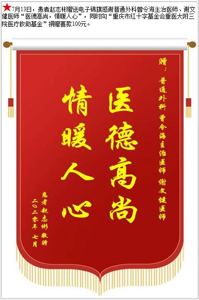 患者赵志彬赠送电子锦旗感谢普通外科曾令海主治医师等人,并向医疗救助基金捐赠善款100元-锦旗-患者心声-患者服务-重庆医科大学附属第三医院【官方网站】