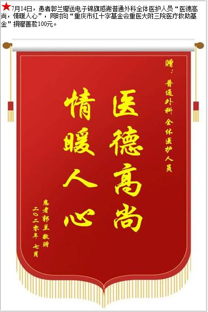 患者郭兰赠送电子锦旗感谢普通外科全体医护人员,并向院医疗救助基金捐赠善款100元-锦旗-患者心声-患者服务-重庆医科大学附属第三医院【官方网站】