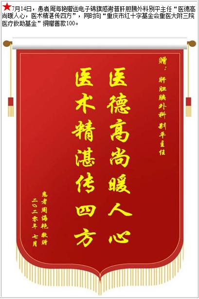 患者周海艳赠送电子锦旗感谢普肝胆胰外科别平主任,并向医疗救助基金捐赠善款100元-锦旗-患者心声-患者服务-重庆医科大学附属第三医院【官方网站】