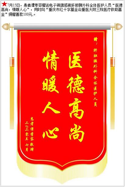 患者谭孝容赠送电子锦旗感谢肝胆胰外科全体医护人员,并向医疗救助基金捐赠善款100元-锦旗-患者心声-患者服务-重庆医科大学附属第三医院【官方网站】