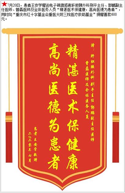 患者王安学赠送电子锦旗感谢肝胆胰外科别平主任等人及全体医务人员,并向医疗救助基金捐赠善款600元-锦旗-患者心声-患者服务-重庆医科大学附属第三医院【官方网站】