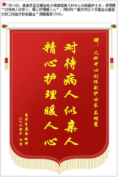 患者李孟丞赠送电子锦旗感谢儿科中心刘练副护士长等人,并向医疗救助基金捐赠善款100元-锦旗-患者心声-患者服务-重庆医科大学附属第三医院【官方网站】