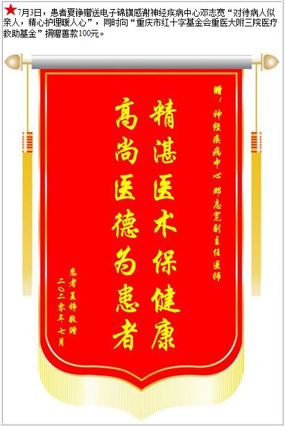 患者夏铮赠送电子锦旗感谢神经疾病中心邓志宽,并向医疗救助基金捐赠善款100元-锦旗-患者心声-患者服务-重庆医科大学附属第三医院【官方网站】