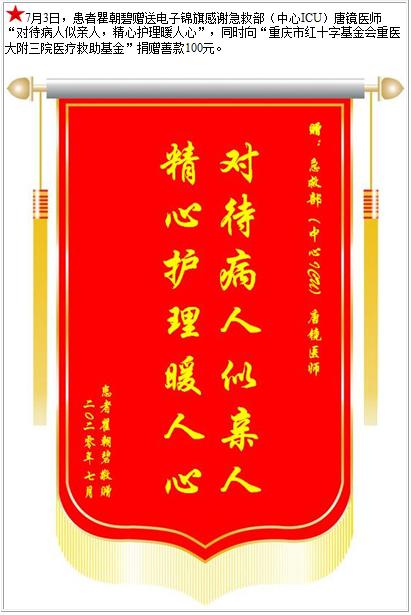 患者瞿朝碧赠送电子锦旗感谢急救部(中心ICU)唐镜医师,并向医疗救助基金捐赠善款100元-锦旗-患者心声-患者服务-重庆医科大学附属第三医院【官方网站】