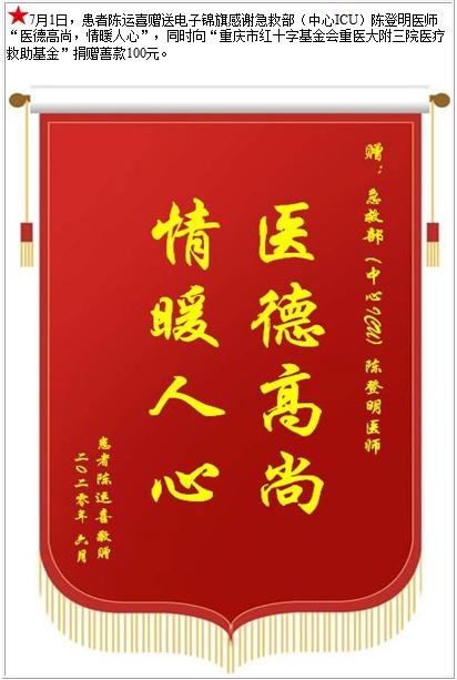 患者陈运喜赠送电子锦旗感谢急救部(中心ICU)陈登明医师,并向医疗救助基金捐赠善款100元-锦旗-患者心声-患者服务-重庆医科大学附属第三医院【官方网站】