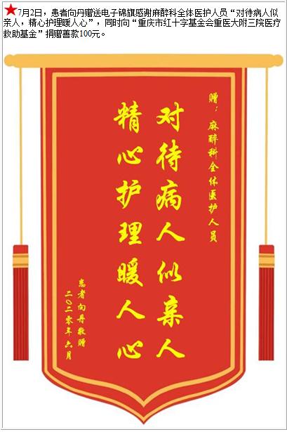 患者向丹赠送电子锦旗感谢麻醉科全体医护人员,并向医疗救助基金捐赠善款100元-锦旗-患者心声-患者服务-重庆医科大学附属第三医院【官方网站】