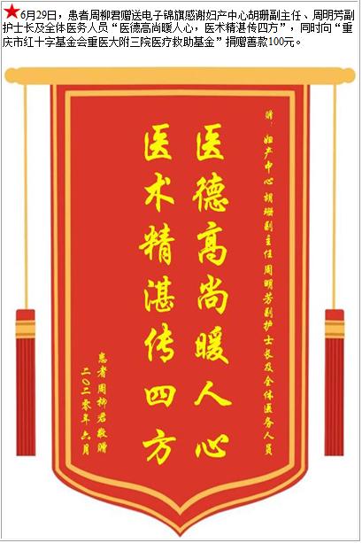 患者周柳君赠送电子锦旗感谢妇产中心胡珊副主任等人及全体医务人员,并向医疗救助基金捐赠善款100元-锦旗-患者心声-患者服务-重庆医科大学附属第三医院【官方网站】