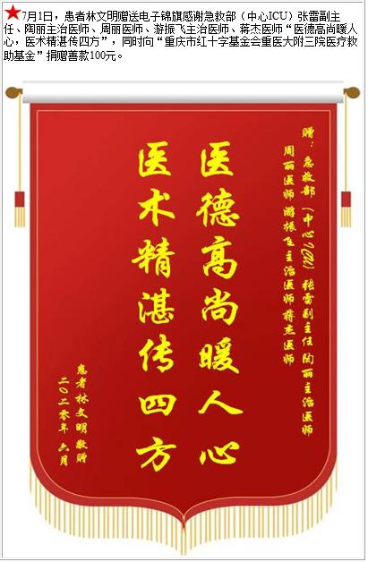 患者林文明赠送电子锦旗感谢急救部(中心ICU)张雷副主任等人,并向医疗救助基金捐赠善款100元-锦旗-患者心声-患者服务-重庆医科大学附属第三医院【官方网站】