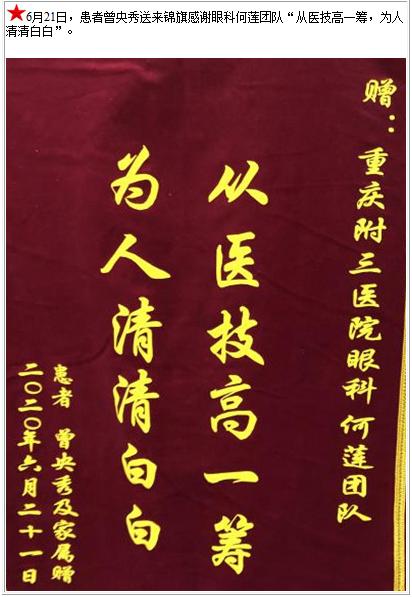 患者曾央秀送来锦旗感谢眼科何莲团队“从医技高一筹,为人清清白白”-锦旗-患者心声-患者服务-重庆医科大学附属第三医院【官方网站】