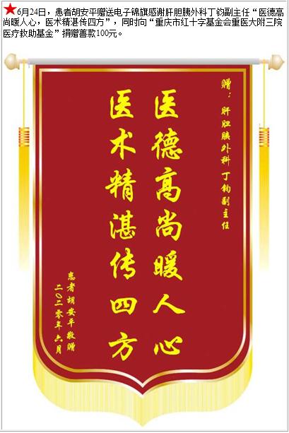 患者胡安平赠送电子锦旗感谢肝胆胰外科丁钧副主任,并向医疗救助基金捐赠善款100元-锦旗-患者心声-患者服务-重庆医科大学附属第三医院【官方网站】