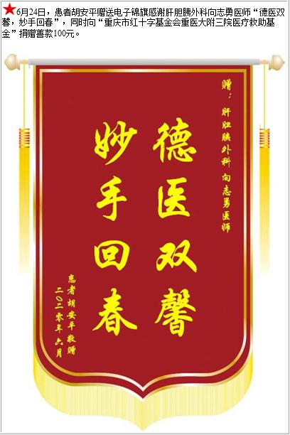 患者胡安平赠送电子锦旗感谢肝胆胰外科向志勇医师,并向医疗救助基金捐赠善款100元-锦旗-患者心声-患者服务-重庆医科大学附属第三医院【官方网站】