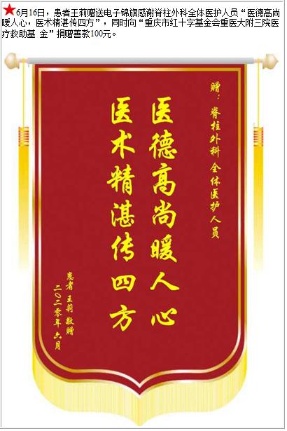 患者王莉赠送电子锦旗感谢脊柱外科全体医护人员,并向医疗救助基金捐赠善款100元-锦旗-患者心声-患者服务-重庆医科大学附属第三医院【官方网站】