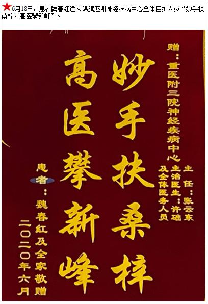 患者魏春红送来锦旗感谢神经疾病中心全体医护人员“妙手扶桑梓,高医攀新峰”