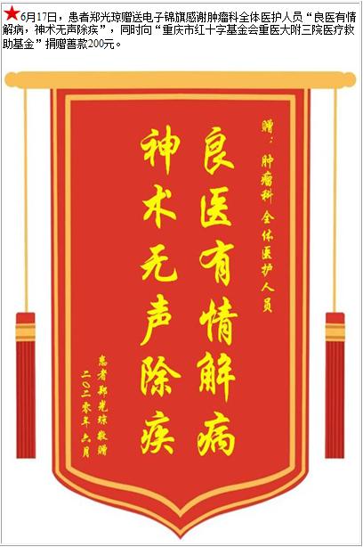 患者郑光琼赠送电子锦旗感谢肿瘤科全体医护人员,并向医疗救助基金捐赠善款200元-锦旗-患者心声-患者服务-重庆医科大学附属第三医院【官方网站】
