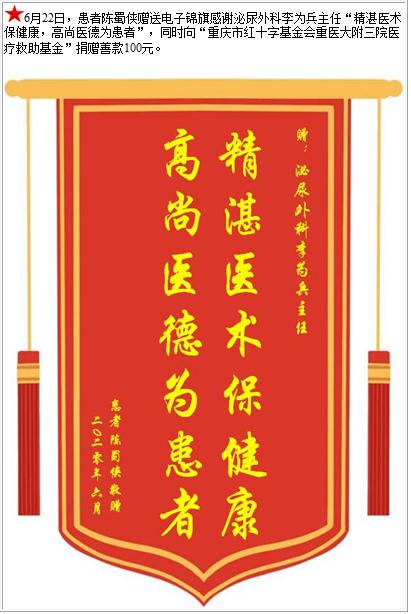 患者陈蜀侠赠送电子锦旗感谢泌尿外科李为兵主任,并向医疗救助基金捐赠善款100元-锦旗-患者心声-患者服务-重庆医科大学附属第三医院【官方网站】