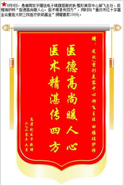 患者陶发平赠送电子锦旗感谢皮肤/整形美容中心郝飞主任等人,并向医疗救助基金捐赠善款100元-锦旗-患者心声-患者服务-重庆医科大学附属第三医院【官方网站】