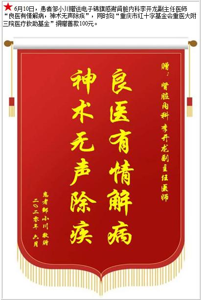 患者邹小川赠送电子锦旗感谢肾脏内科李开龙副主任医师,并向医疗救助基金捐赠善款100元-锦旗-患者心声-患者服务-重庆医科大学附属第三医院【官方网站】
