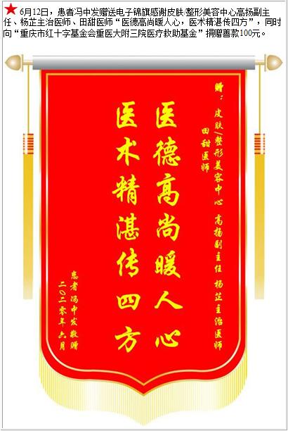患者冯中发赠送电子锦旗感谢皮肤/整形美容中心高扬副主任等人,并向医疗救助基金捐赠善款100元-锦旗-患者心声-患者服务-重庆医科大学附属第三医院【官方网站】