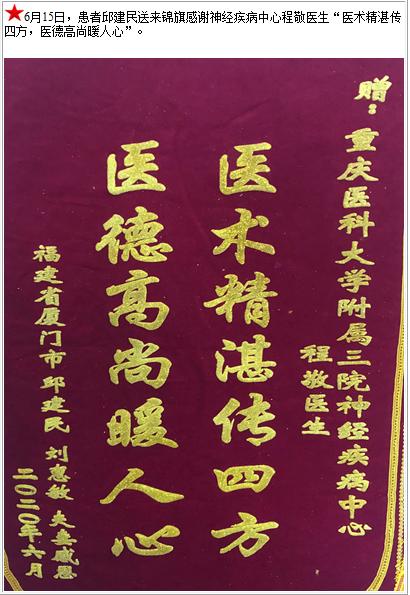 患者邱建民送来锦旗感谢神经疾病中心程敬医生“医术精湛传四方,医德高尚暖人心”-锦旗-患者心声-患者服务-重庆医科大学附属第三医院【官方网站】