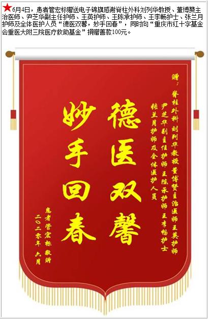 患者管宏标赠送电子锦旗感谢脊柱外科刘列华教授等人及全体医护人员,并向医疗救助基金捐赠善款100元-锦旗-患者心声-患者服务-重庆医科大学附属第三医院【官方网站】