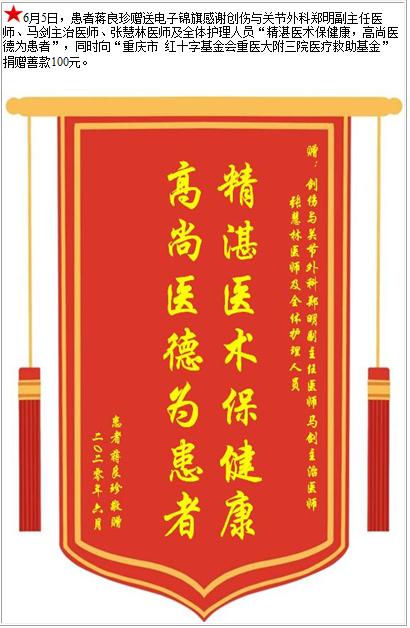 患者蒋良珍赠送电子锦旗感谢创伤与关节外科郑明副主任医师等人及全体护理人员,并向医疗救助基金捐赠善款100元-锦旗-患者心声-患者服务-重庆医科大学附属第三医院【官方网站】