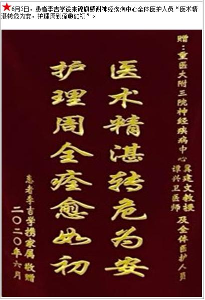 患者李吉学送来锦旗感谢神经疾病中心全体医护人员“医术精湛转危为安,护理周到痊愈如初”-锦旗-患者心声-患者服务-重庆医科大学附属第三医院【官方网站】