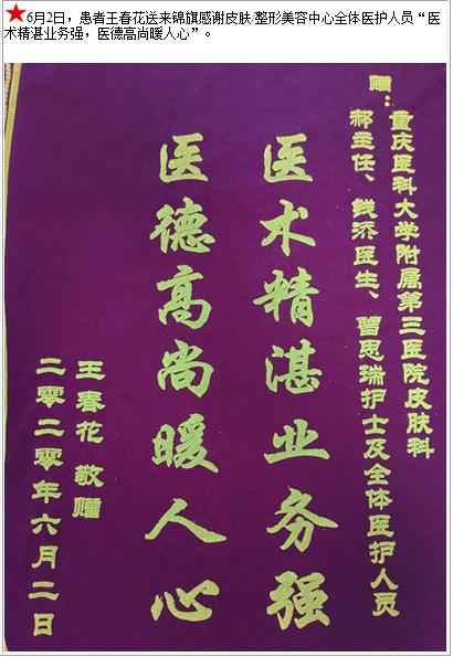 患者王春花送来锦旗感谢皮肤/整形美容中心全体医护人员“医术精湛业务强,医德高尚暖人心”-锦旗-患者心声-患者服务-重庆医科大学附属第三医院【官方网站】