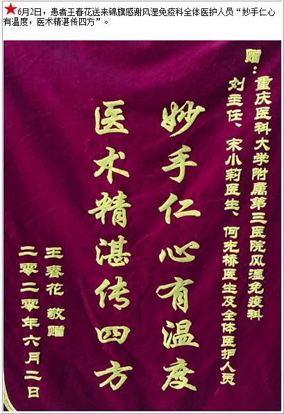 患者王春花送来锦旗感谢风湿免疫科全体医护人员“妙手仁心有温度,医术精湛传四方”-锦旗-患者心声-患者服务-重庆医科大学附属第三医院【官方网站】