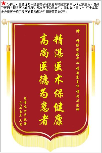 患者陈方平赠送电子锦旗感谢神经疾病中心张云东主任等人,并向医疗救助基金捐赠善款100元-锦旗-患者心声-患者服务-重庆医科大学附属第三医院【官方网站】