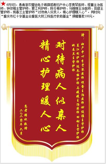 患者游欢赠送电子锦旗感谢妇产中心李贵琴医师等人,并向医疗救助基金捐赠善款100元-锦旗-患者心声-患者服务-重庆医科大学附属第三医院【官方网站】