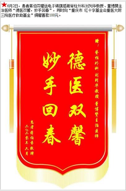 患者蒋伯芬赠送电子锦旗感谢脊柱外科刘列华教授等人,并向医疗救助基金捐赠善款100元-锦旗-患者心声-患者服务-重庆医科大学附属第三医院【官方网站】