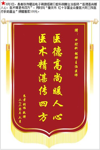 患者张伟赠送电子锦旗感谢口腔科胡娜主治医师,并向医疗救助基金捐赠善款100元-锦旗-患者心声-患者服务-重庆医科大学附属第三医院【官方网站】