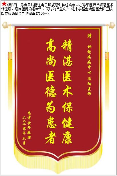 患者黄玲赠送电子锦旗感谢神经疾病中心冯阳医师,并向医疗救助基金捐赠善款100元-锦旗-患者心声-患者服务-重庆医科大学附属第三医院【官方网站】