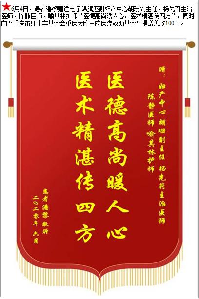 患者潘黎赠送电子锦旗感谢妇产中心胡珊副主任等人,并向医疗救助基金捐赠善款100元-锦旗-患者心声-患者服务-重庆医科大学附属第三医院【官方网站】