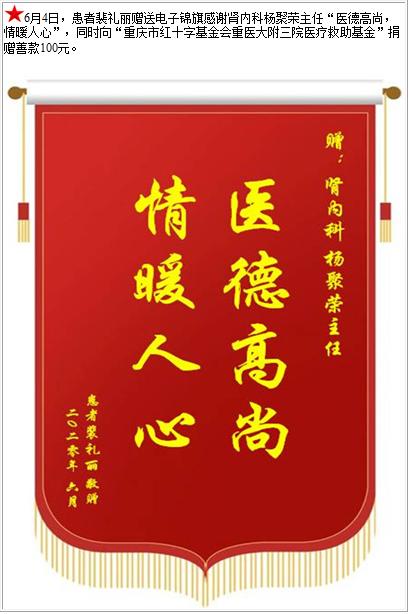 患者裴礼丽赠送电子锦旗感谢肾内科杨聚荣主任,并向医疗救助基金捐赠善款100元-锦旗-患者心声-患者服务-重庆医科大学附属第三医院【官方网站】
