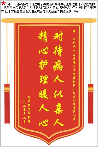 患者杨思成赠送电子锦旗感谢儿科中心王丽雁主任等人及全体医护人员,并向医疗救助基金捐赠善款100元-锦旗-患者心声-患者服务-重庆医科大学附属第三医院【官方网站】