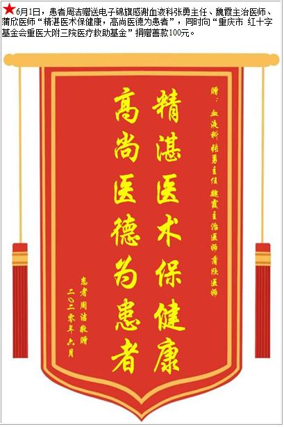 患者周洁赠送电子锦旗感谢血液科张勇主任等人,并向医疗救助基金捐赠善款100元-锦旗-患者心声-患者服务-重庆医科大学附属第三医院【官方网站】