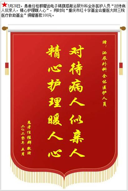 患者任桂群赠送电子锦旗感谢泌尿外科全体医护人员,并向医疗救助基金捐赠善款100元-锦旗-患者心声-患者服务-重庆医科大学附属第三医院【官方网站】