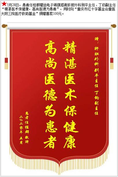患者任桂群赠送电子锦旗感谢肝胆外科别平主任等人,并向医疗救助基金捐赠善款100元-锦旗-患者心声-患者服务-重庆医科大学附属第三医院【官方网站】